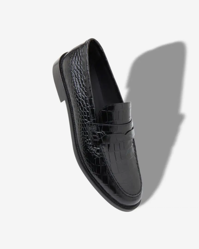 A great pair of shoes to throw on with a slim-fit suit for a fancy dinner or your favourite jeans for everyday wear, Manolo Blahnik's black calf leather penny loafers feature a crocodile effect design and apron cut styling.