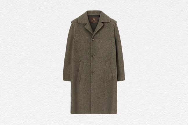 With a look not dissimilar to tweed — and a felt-like finish typical of English fabrics — this long Loro Piana winter coat is cut from an alpaca-cashmere blend, and features roomy welt pockets with suede detailing, suede tabs and toggle cuffs.