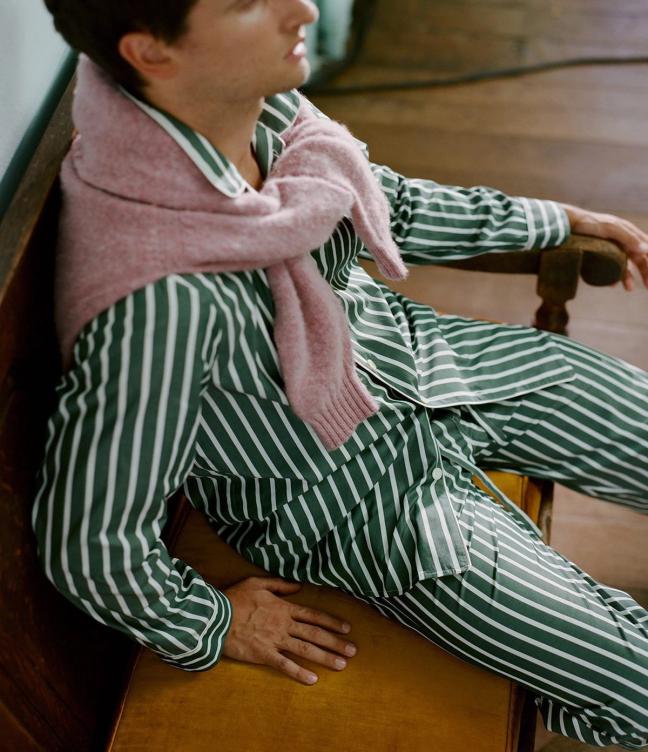 Make a statement at sunrise and sunset with the wide-stripe cotton pyjama set; and dress-up your dressing gown game with a statement bird-and-flower patterned piece complete with quilted cuffs and teal silk lapels (versions in plaid and a variety of sumptuous paisleys further pad out the seasons’s options).