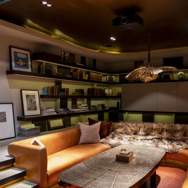 Further shared areas include the library-cinema room in the basement, which showcases a chestnut-leather conversation pit and an adjacent bar, all of which is lit up by a bronze light fixture inspired by the style of French designer Charlotte Perriand. In the rear garden, there is spacious living space; out front is a decorative walled courtyard garden; and above is a roof terrace – the perfect spot from where to soak in the surrounds.