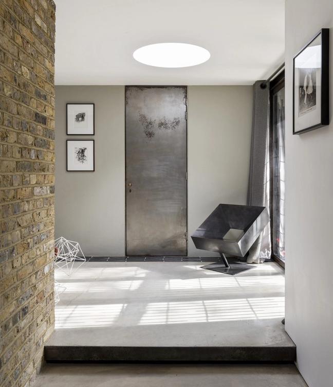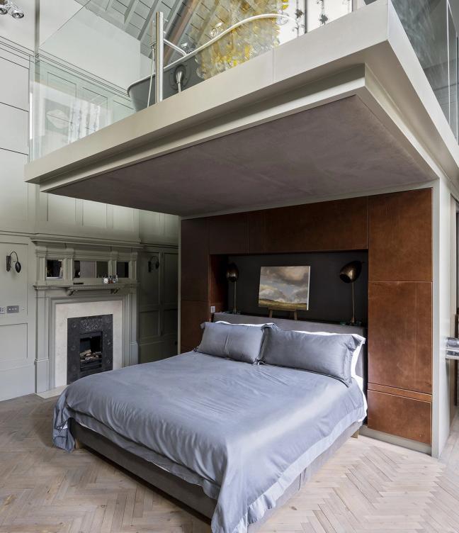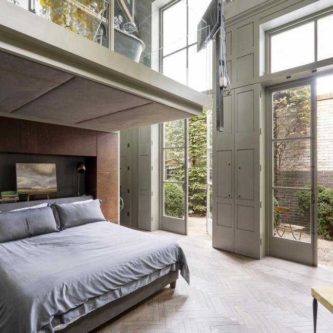 Through a secret door in the brick wall you’ll find the bedroom, which links the old property to the new and showcases original parquet flooring – a feature that makes use of reclaimed wood from the Partridge Fine Art of Bond Street workshop, which once resided in the space.