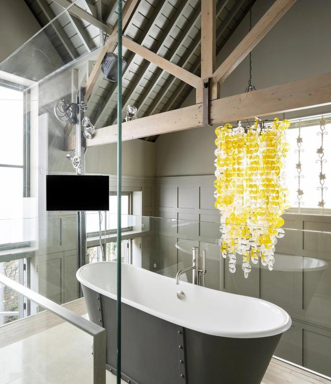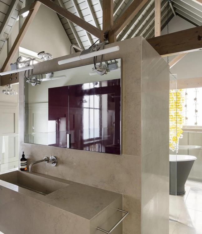 You’ll also find double-height shuttered windows that look onto the walled garden and let an abundance of light flow in, as well as a bathroom that theatrically cantilevers above the bed.