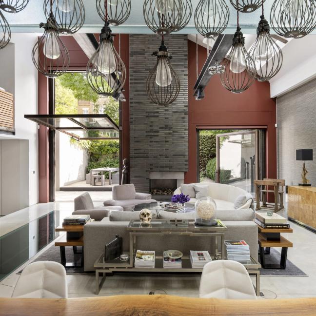 Within the same area is a sunken kitchen that takes its cues from Frank Sinatra’s home in Palm Springs, a light, geometric space whose refined appearance prioritises form and functionality. Moreover, the building’s industrial hallmarks have been preserved, providing a tactile quality – notably, a huge hydraulically operated wall in the living room tips upwards, a feature that not only opens the interior up to the garden, but one that can also act as a canopy; similarly, a winch with gears can allow for a large, elongated chandelier to be lowered and raised over the dining table.